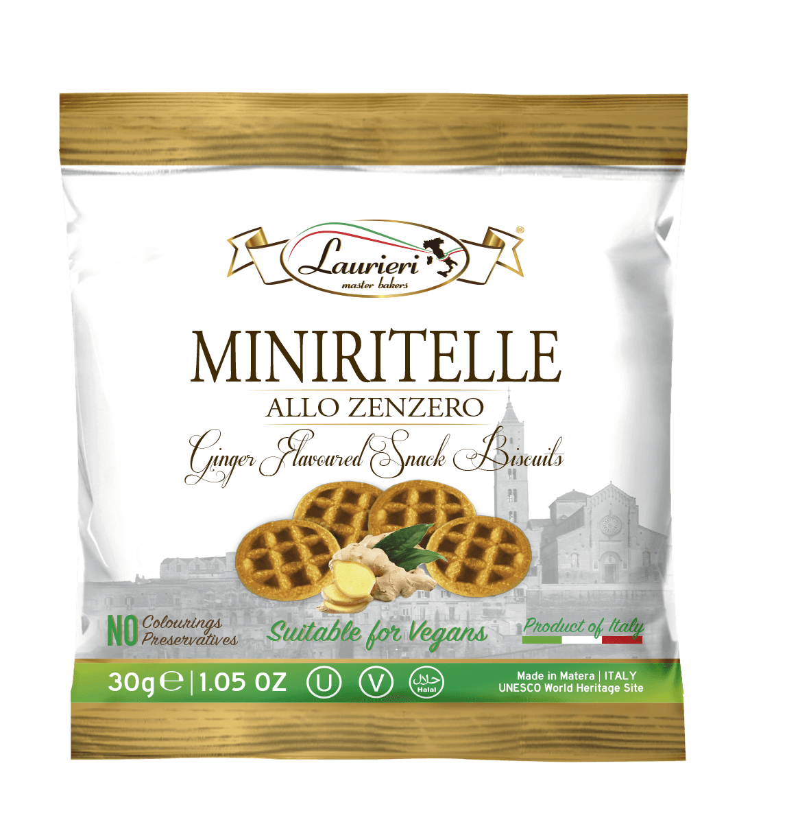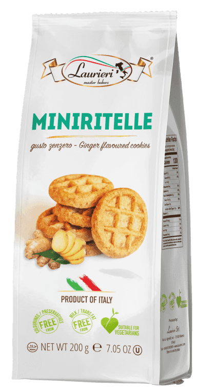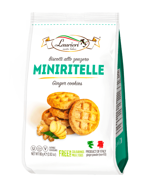 Farina di GRANO, zucchero, olio di girasole, amido di mais, sciroppo di glucosio, 1% polvere di zenzero (non-UE), agenti lievitanti (bicarbonato ammonico, bicarbonato di sodio), aromi, sale marino.