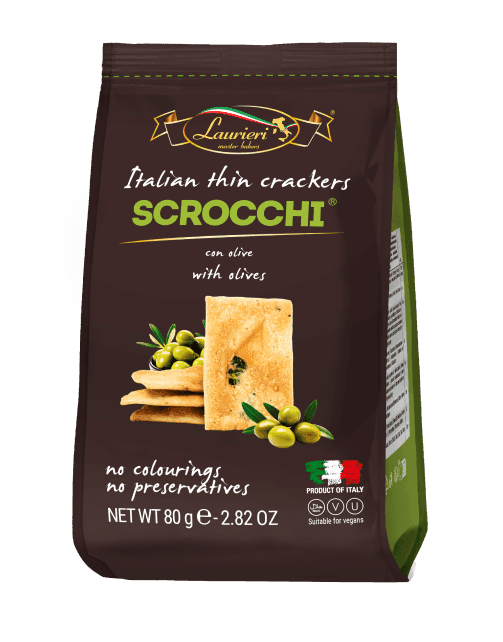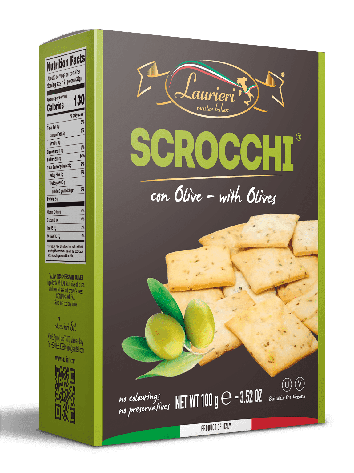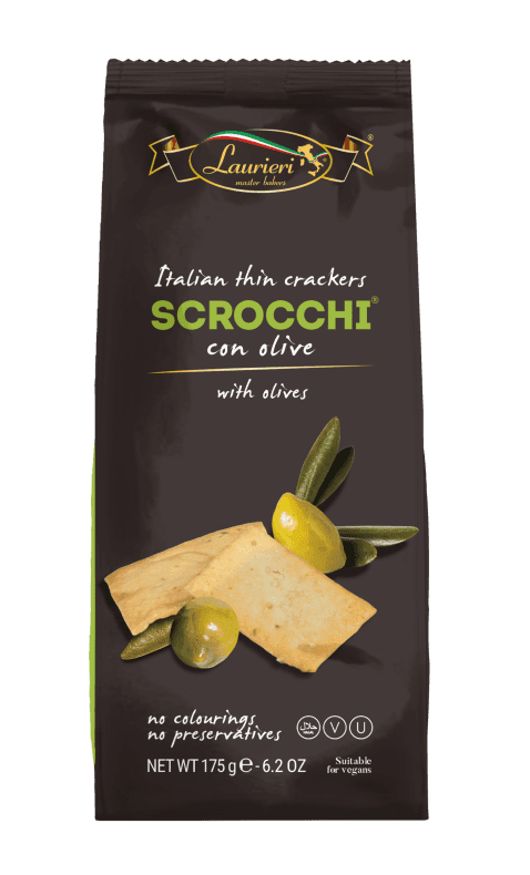 Farina di FRUMENTO, olio d'oliva, 8% di olive (UE), olio di semi di girasole, sale marino, lievito.
